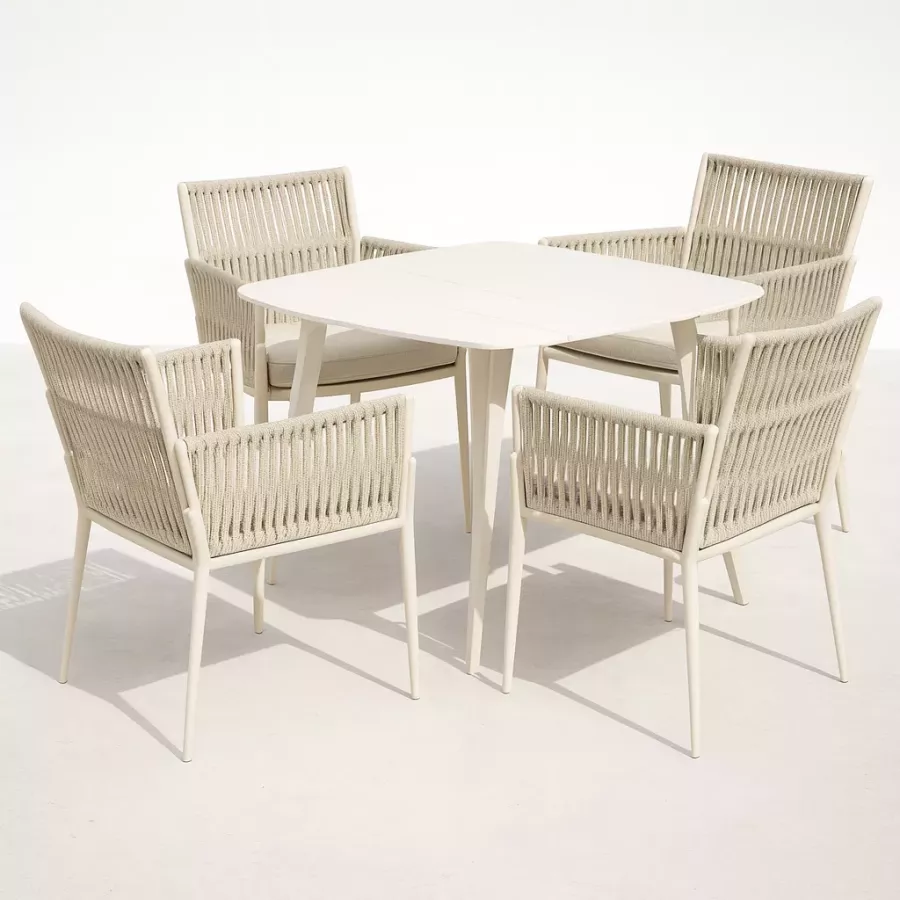 Ensemble repas haut de gamme HASTIA 4 places. Table carrée plateau ceramique aux bords arrondis (90 cm) en aluminium thermolaqué blanc, résistante aux UV, à l’humidité et à la corrosion. 4 fauteuils assortis en aluminium avec dossier tressé beige et coussin d’assise en spun polyester beige, respirant, déhoussable et conçu pour l’extérieur.