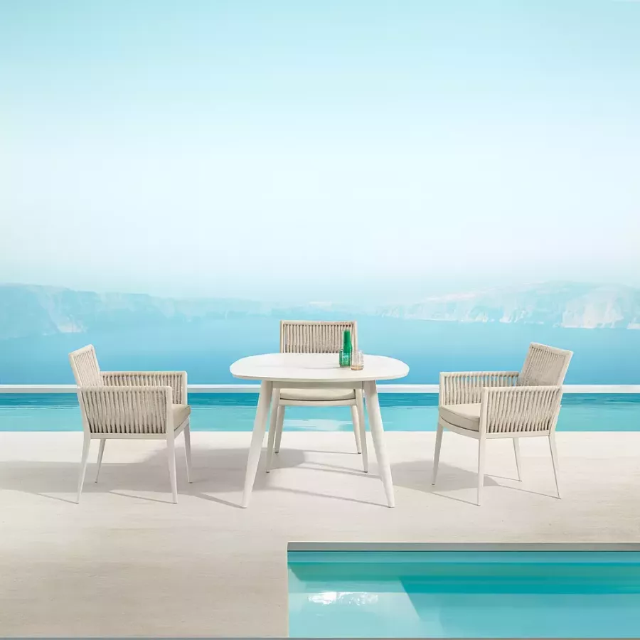 La structure de la table est conçue en aluminium thermolaqué blanc, montée sur un profil 30 × 25 mm (épaisseur 1,5 mm). Ce matériau est particulièrement apprécié dans le mobilier outdoor haut de gamme pour sa légèreté, sa solidité et sa résistance à la corrosion, notamment dans les environnements proches de la mer comme Monaco, Cannes ou Nice.