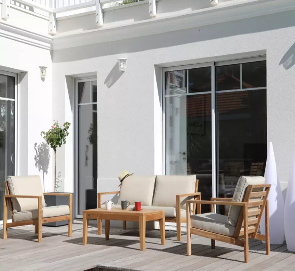 Que vous soyez en Martinique, en Guadeloupe, à Saint-Martin ou à Saint-Barthélemy, cet ensemble s’intègre parfaitement dans un cadre tropical, sur une terrasse en bois, un patio ombragé ou face à la mer. Le beige sable des coussins, discret et élégant, rehausse la teinte dorée du bois pour une ambiance à la fois contemporaine et chaleureuse.